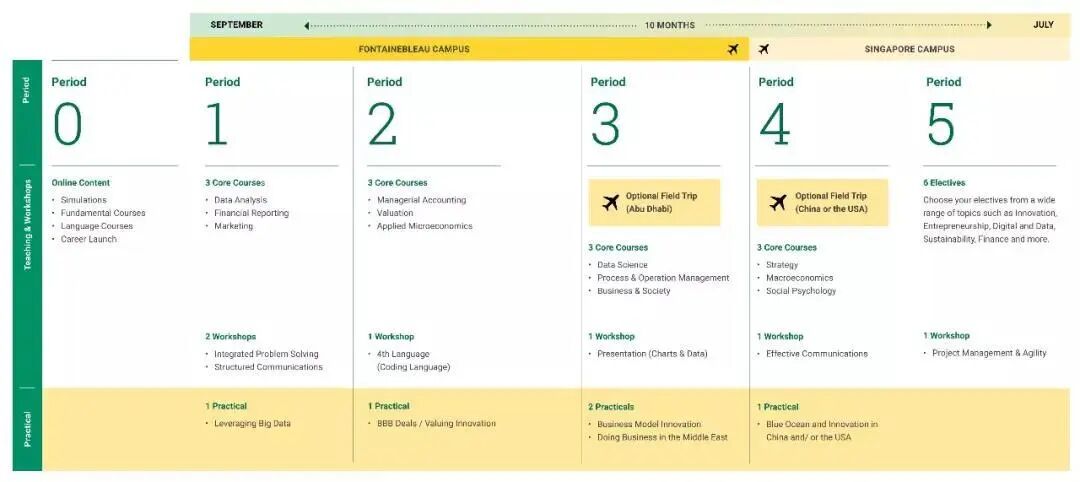 INSEAD 的MIM項目總共14-16個月,課程時長10個月,包含5個階段,每個階段有8周的課程。