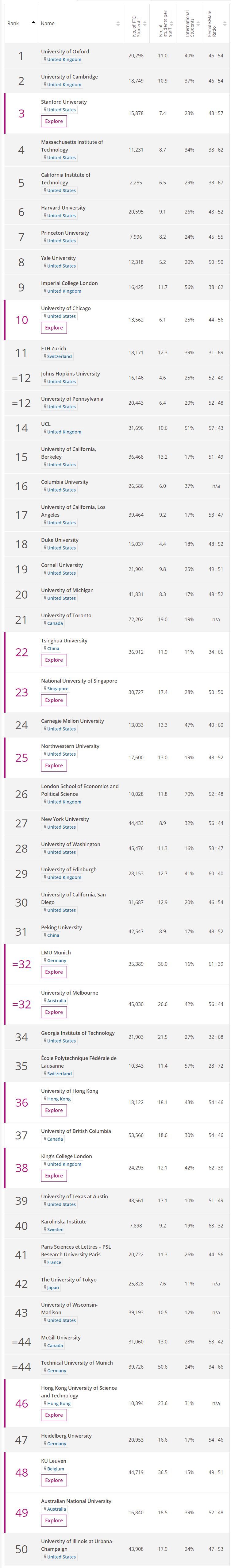 日本共有103所大學進榜,取代英國成為數量第二多的國家。英國共有98所大學進榜。法國首次有大學進入TOP50。