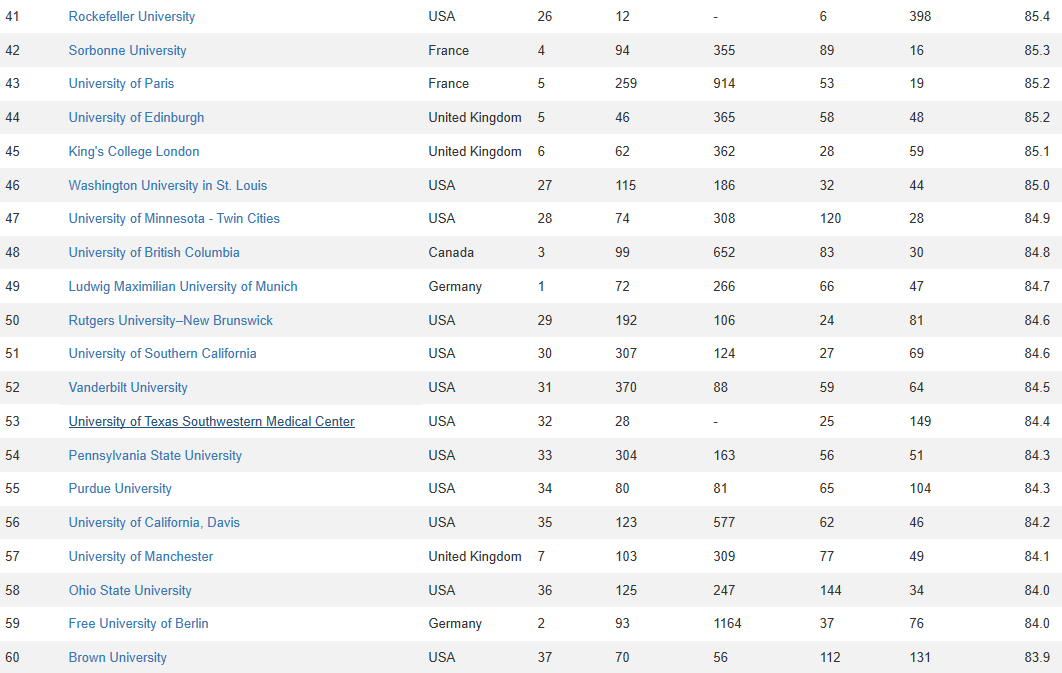 自2012年該排名開始以來,美國一直在排名前十里占據最多的排名數量。今年,有8所大學進入了前十名。而在排名的2000所大學里,有357所來自美國。今年所有的常春藤盟校也都進入了前60名。