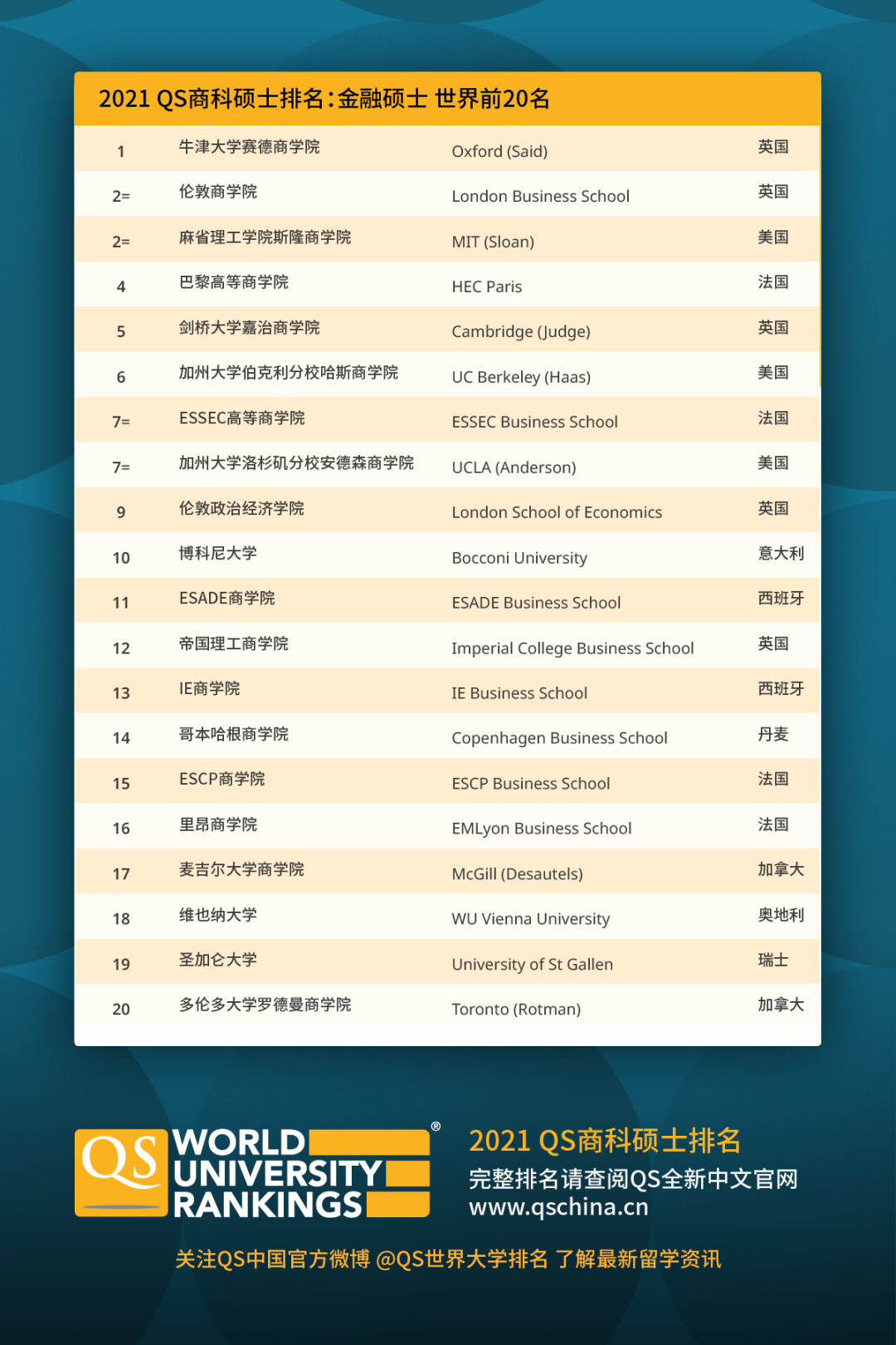 2020 年 9 月 23 日,全球高等教育研究機(jī)構(gòu) QS(Quacquarelli Symonds)發(fā)布了最新2021 年商科碩士排名。