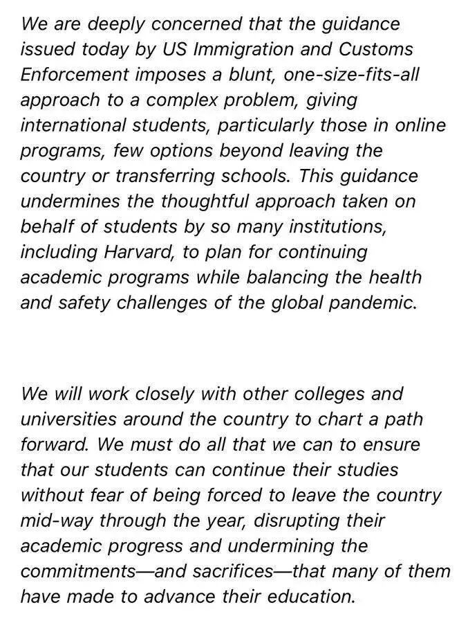 “哈佛將會和其他美國大學商量出解決辦法。我們會盡全力保證我們的學生能夠順利完成學業,不必擔心中途被趕出美國,盡全力保證他們為來到這里繼續教育所做出的犧牲和承諾不被白費。”