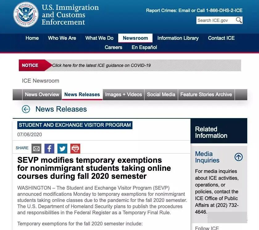 美國海關移民總署(Student and Exchange Visitor Program,簡稱SEVP)官方發布了針對2020年秋季學期修網課留學生(F1/M1簽證持有者)的最新規定。
