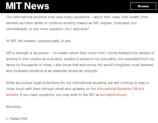 麻省理工大學校長拉斐爾·雷夫(L. Rafael Reif)致麻省理工學院社區的公開信中稱,該命令擾亂了國際學生的生活,并危及到他們的科研追求。