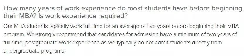4,工作經驗。學院“強烈建議申請者至少要有兩年的全職工作經驗”,因為學院“通常不直接招收本科畢業生”。另外還提到MBA的錄取者平均有5年的全職工作經驗,70%以上的學生曾在國外學習、工作或者生活過(即所謂的“全球視野”)。