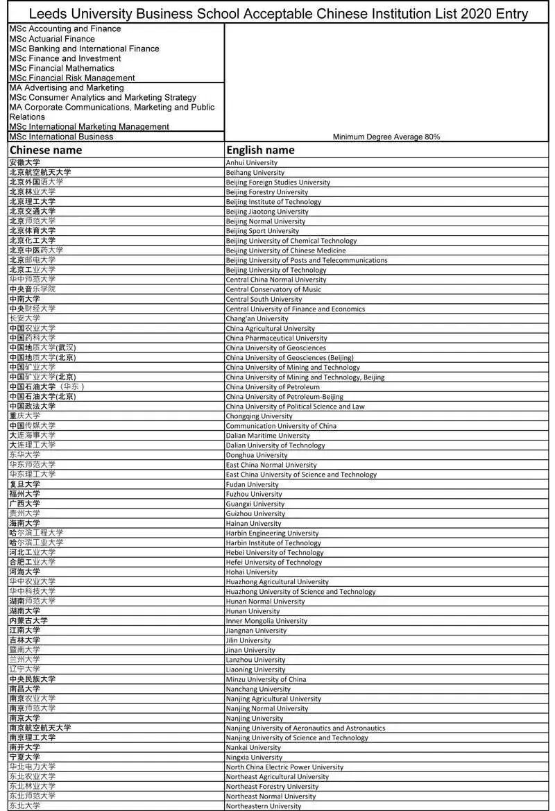 利茲大學官網更新了商學院2020年申請認可的中國院校名單,需要注意的是: