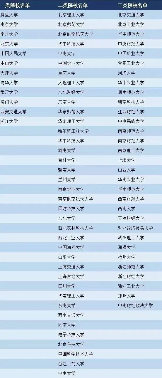 認可院校名單被詳細地根據等級劃分。不同的的專業會對不同等級的院校制定不同的最低分數要求。