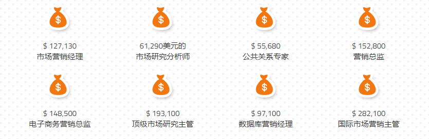 另外美國勞工統計局的數據顯示,市場分析師的入門級薪水為60,300美元,而在工作3-5年,到達管理崗后,市場營銷經理的中位數薪資為127,130美元,薪資非常豐厚。