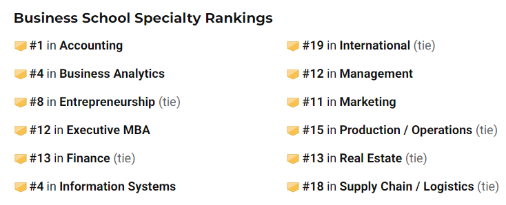 此外,學(xué)校還有很多熱門的研究生課程非常頂尖,如會(huì)計(jì)專業(yè)全美第1,石油工程全美第1,計(jì)算機(jī)科學(xué)專業(yè)全美第10,商業(yè)分析項(xiàng)目在QS世界排名中位居第4……