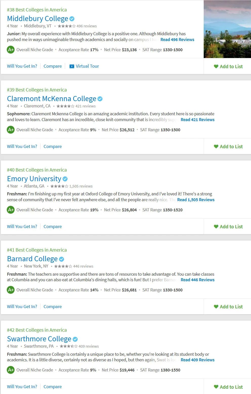 所以,Niche的評價(jià)標(biāo)準(zhǔn)與福布斯榜單參考美國教育部、Payscale、Niche、國家科學(xué)基金會(huì)等數(shù)據(jù)不同;Niche綜合了美國教育部的學(xué)術(shù)、招生、財(cái)務(wù)和學(xué)生生活數(shù)據(jù)。和主要衡量學(xué)生學(xué)習(xí)的投入產(chǎn)出比,重點(diǎn)考慮“回報(bào)”的福布斯榜單最大的區(qū)別在于:Niche更傾向于普通學(xué)生的體驗(yàn)。