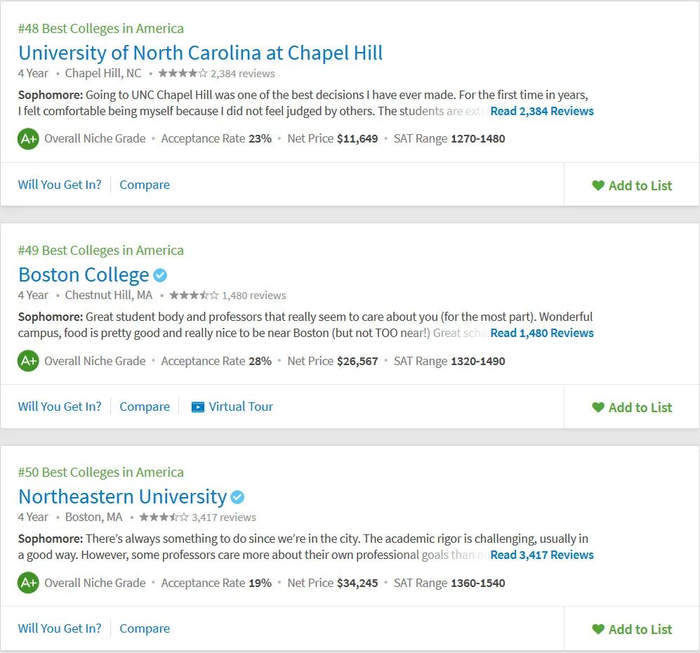 Niche確實(shí)有一部分內(nèi)容是星級評價(jià),但有很大的區(qū)別,體現(xiàn)在評價(jià)的真實(shí)性和其他數(shù)據(jù)的多樣性支持。當(dāng)中,最讓Niche深入人心的部分,還是數(shù)百萬來自高校學(xué)生和校友的評價(jià)。