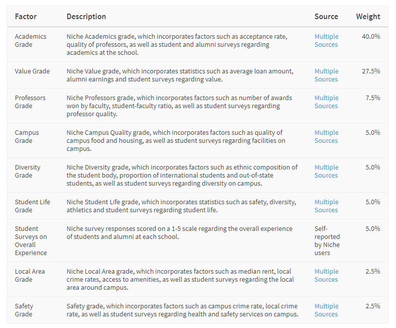 Niche的評分標(biāo)準(zhǔn)分別為:學(xué)術(shù)、價(jià)值(包括學(xué)生貸款、畢業(yè)收入等)、教學(xué)質(zhì)量、校園評價(jià)(包括食物、住宿等)、多樣性、校園生活、整體評價(jià)、當(dāng)?shù)厍闆r和安全。具體評分權(quán)重占比如下: