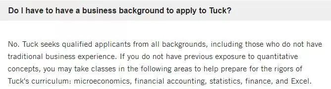 任何專業(yè)的同學(xué)都可以申請達(dá)特茅斯的MBA項(xiàng)目,學(xué)校“從各個(gè)背景尋找合格的申請人,包括那些沒有經(jīng)驗(yàn)的人”。當(dāng)然,如果想增大錄取幾率或者適應(yīng)之后的學(xué)習(xí),學(xué)校也建議大家先準(zhǔn)備一下微觀經(jīng)濟(jì)學(xué)、財(cái)務(wù)會(huì)計(jì)、統(tǒng)計(jì)、財(cái)務(wù)和Excel的相關(guān)知識(shí)。